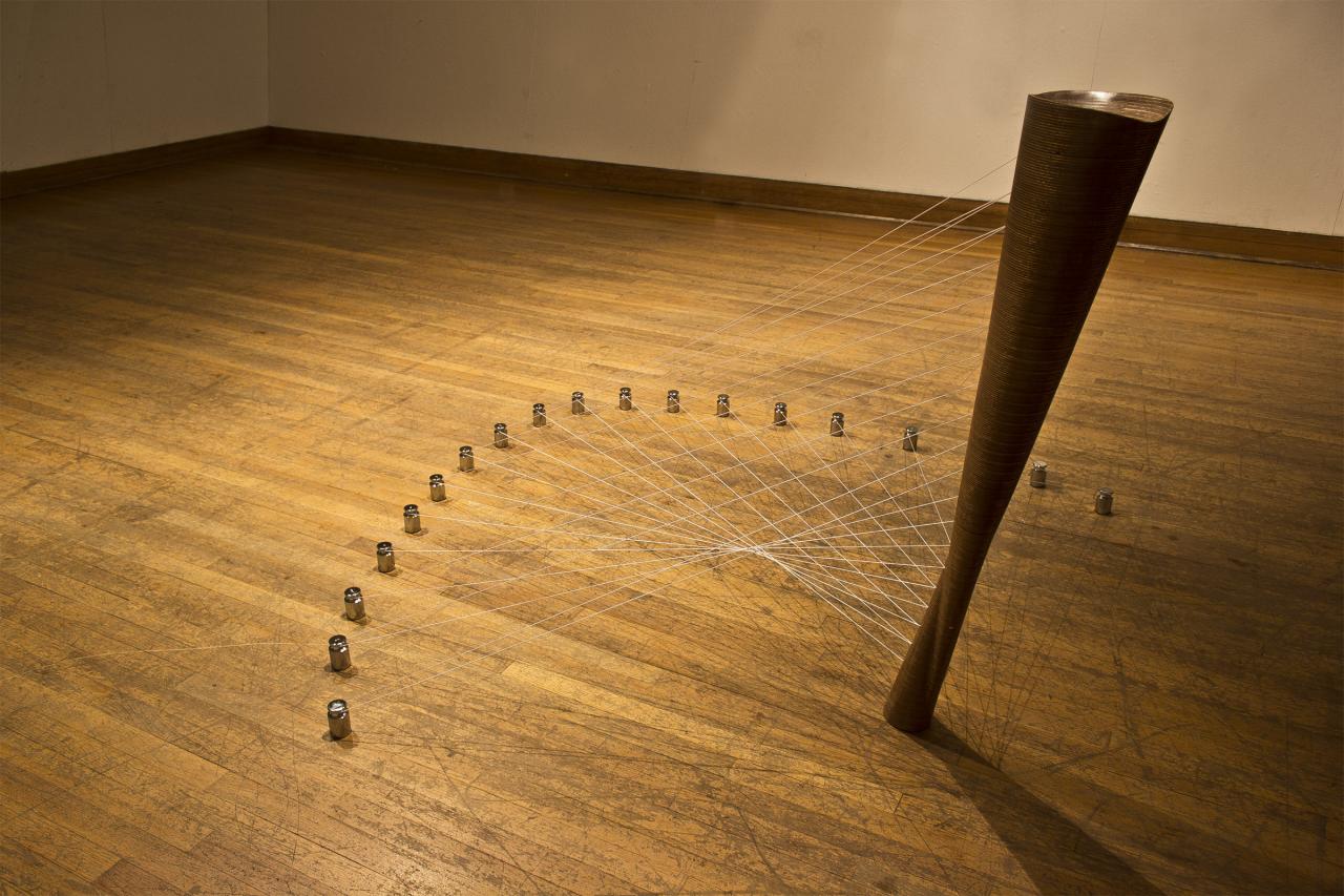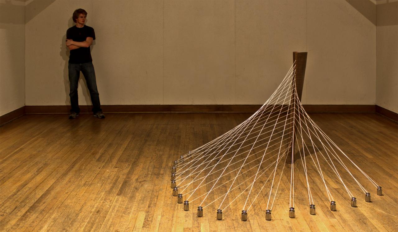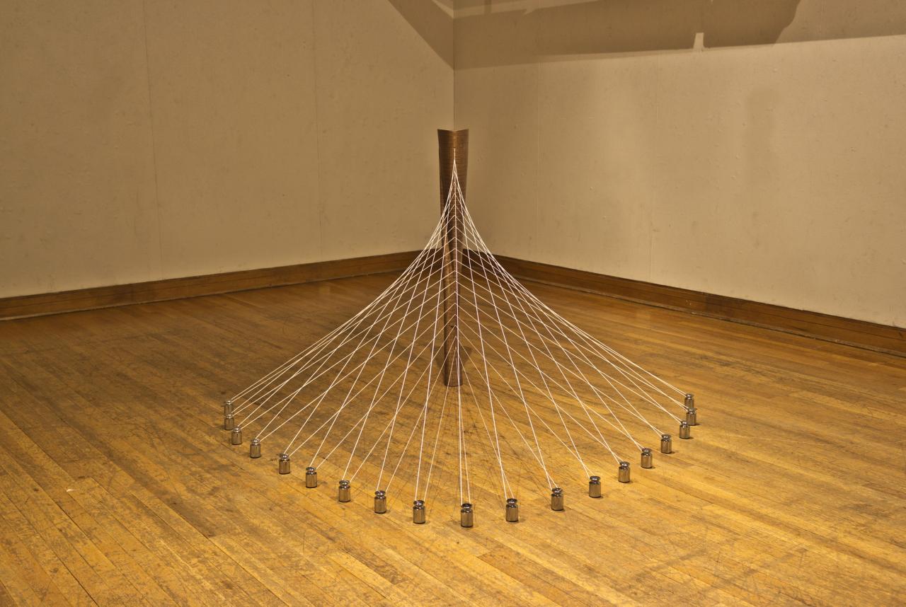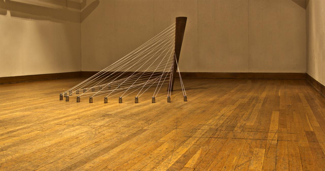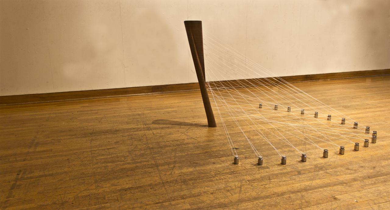 Through experience, we develop expectations of the physical world and an intuitive understanding of physics. When this intuition is challenged we become intrigued. This is why we love magic. Andrew Bellatti Green approaches the realm of magic and challenges our physical intuitions with Tethered. The work is rather simple in form, yet powerful. The perfect balance achieved between the wooden totem and the weights to which it is tethered leads one to inquiry. “Would it fall if I picked up one of the weights?” “Is it purely in balance or is it fixed to the floor?” “Is this solid wood?” “Where does one string end and one begin?” Anytime we ask questions of this nature, we begin to try and answer them, which in turn leads to more questions. This is what Elaine Scarry refers to as “encouraging and inciting deliberation”. We think we know the answers because the form appears so simple and elegant, yet we circle the work continually, taking a knee, standing over it, touching it when no one is looking, and we still aren’t certain what the answers are. However, we aren’t bothered by the unknowable, but rather excited.